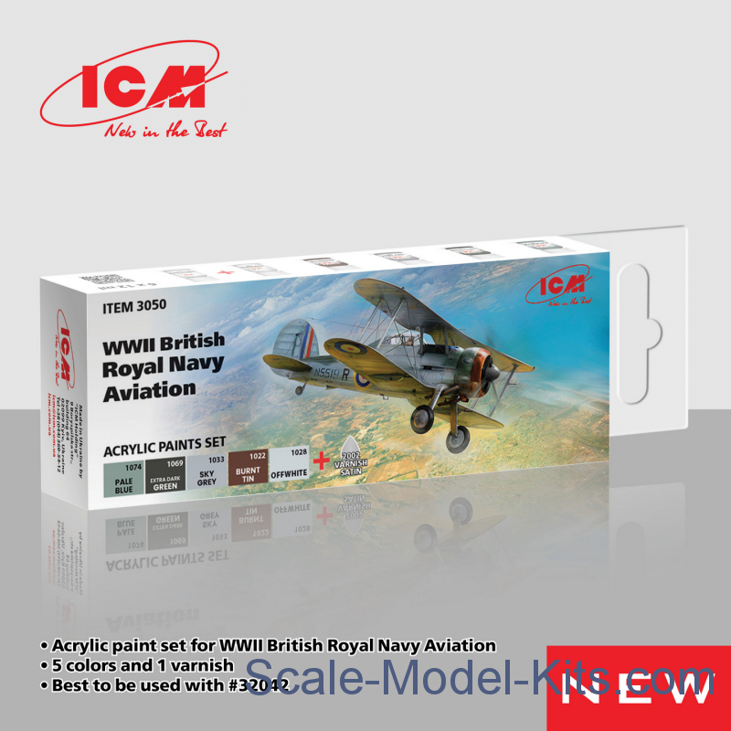 Acrylic paints set for WWII British Royal Navy Aviation, 6 pcsSKU: ICM3050Manufacturer: ICM Price: $9.90 Volume, ml: 12 The paint is prepared to be applied directly from the bottle by brush, use for airbrush with 40 - 60% water or acrylic thinner. Once dry, the colors are permanent and waterproof. They are resistant to oils, enamels, washes, solvents, or any potentially aggressive technique. Avoid low temperatures. |